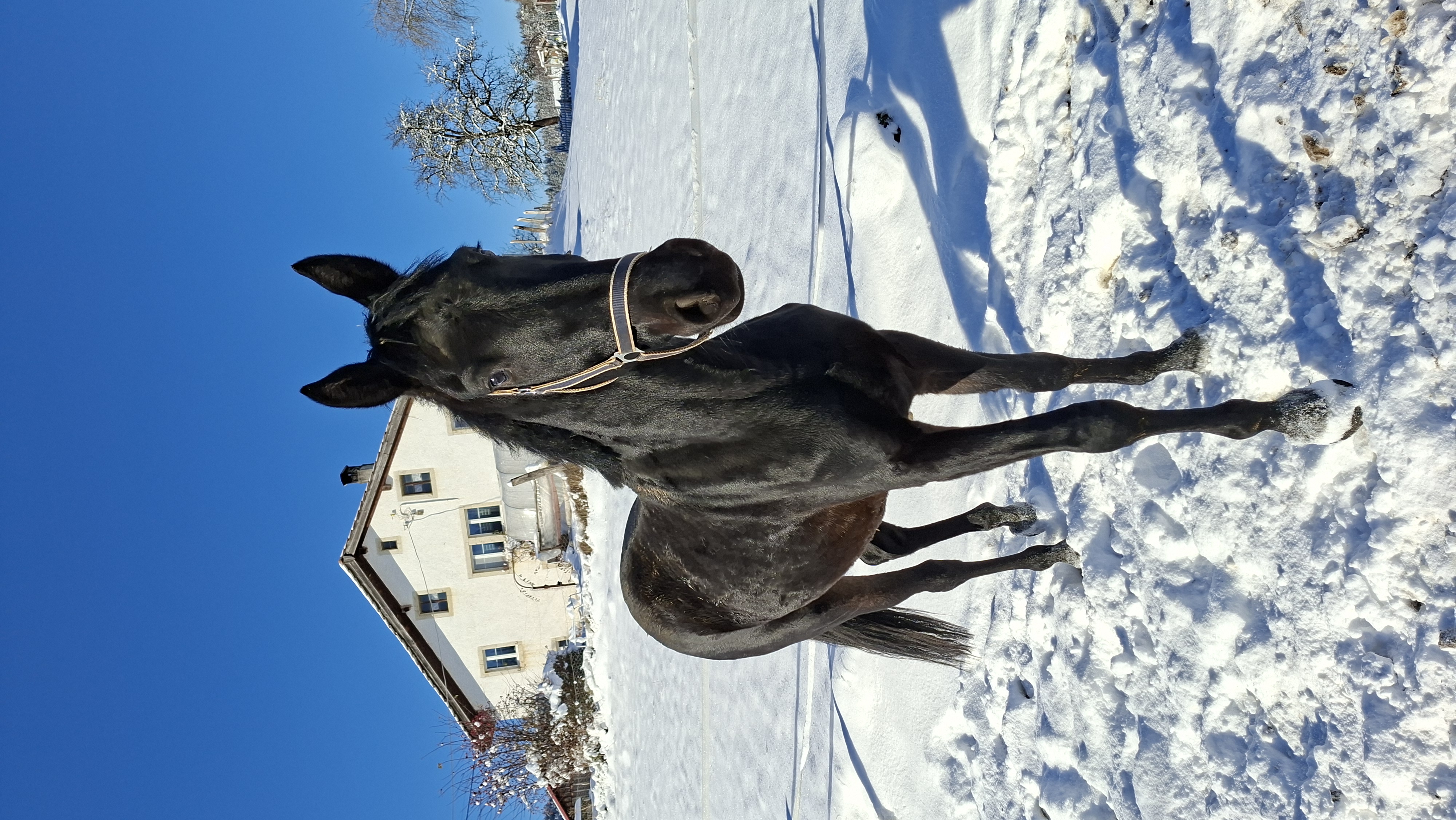 Très gentil aux soins et proche de l'homme, belles allures de base. Vit en stabulation, groupe ok, pas dominant, le boxe lui convient aussi très bien.